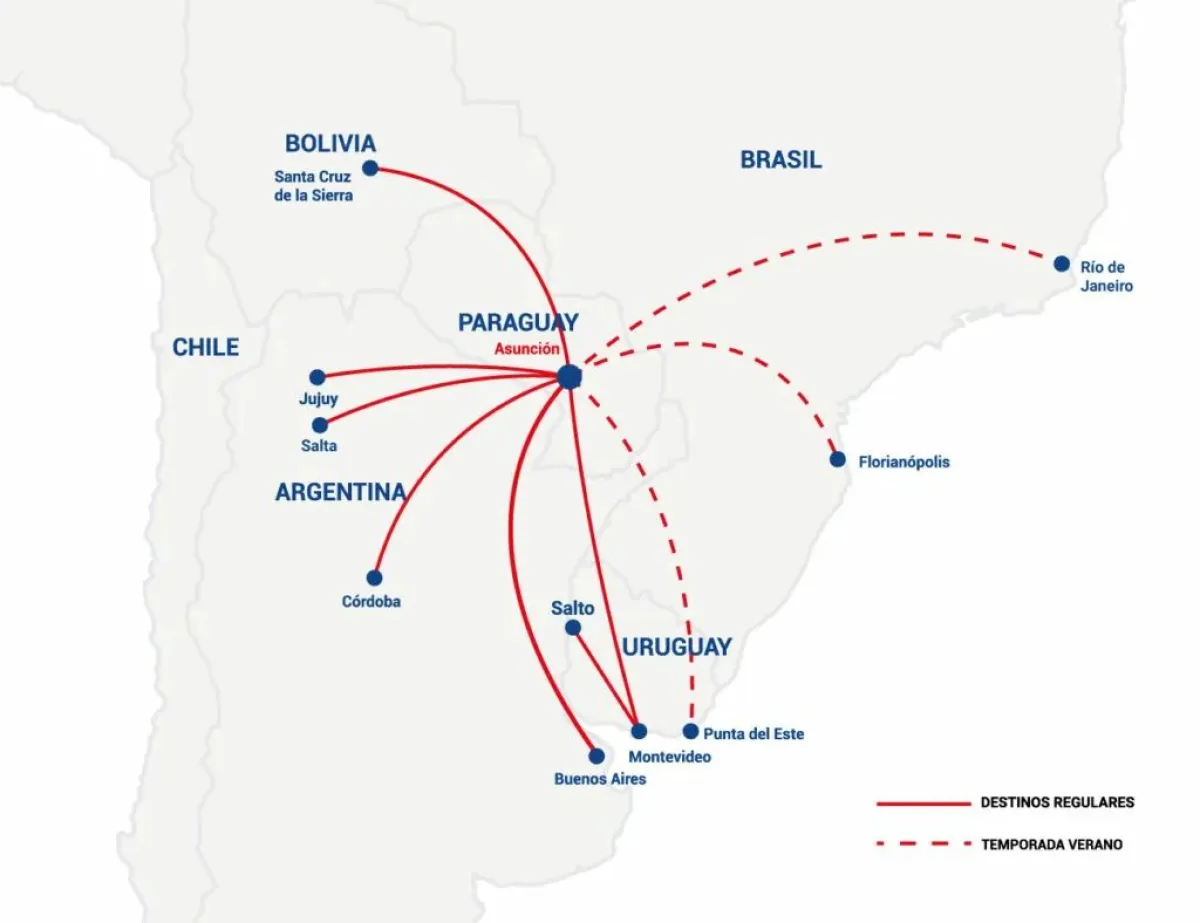 Cabe destacar que, Paranair es la Compañía de Aviación Paraguaya S.A y según su web oficial, centra sus conexiones aéreas en Asunción del Paraguay y desde ahí realiza conexiones entre Brasil, Bolivia, Uruguay y Argentina. Además, actualmente, no cuenta con vuelos a Chile.