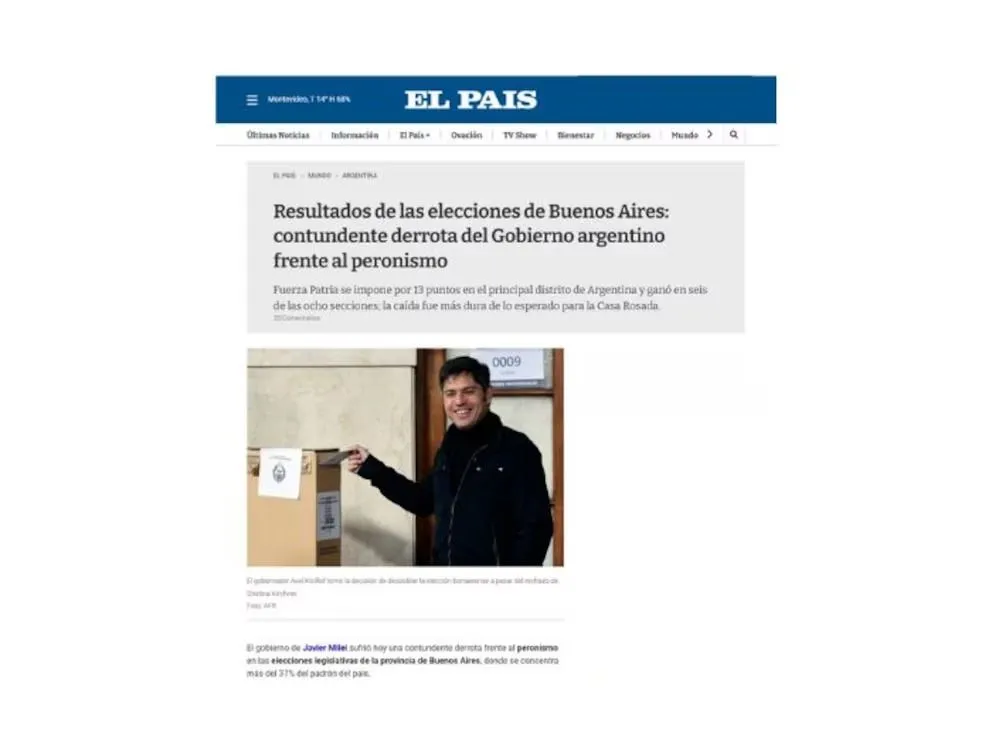 “El peronismo arrasa en Buenos Aires”, comienza diciendo título El País de España. En ese sentido, continuaron: “El partido de Cristina Kirchner supera por más de 13 puntos a los candidatos ultraderechistas en la elección para legisladores provinciales”. Por esto mismo, plantearon: “Es mala idea en Argentina dar por muerto al peronismo antes de tiempo”.