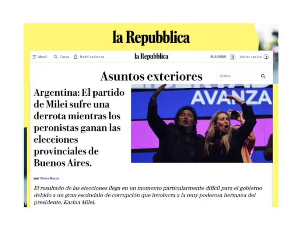 En Italia, La Repubblica tituló: “El partido de Milei sufre una derrota mientras los peronistas ganan las elecciones provinciales de Buenos Aires”. Además, hicieron hincapié en que “el resultado de las elecciones llega en un momento particularmente difícil para el gobierno”, al hacer referencia al escándalo de las coimas en la ANDIS, que tiene como principal investigado al ex funcionario Diego Spagnuolo, quien actualmente se encuentra fuera del Gabinete por decisión del presidente Javier Milei.