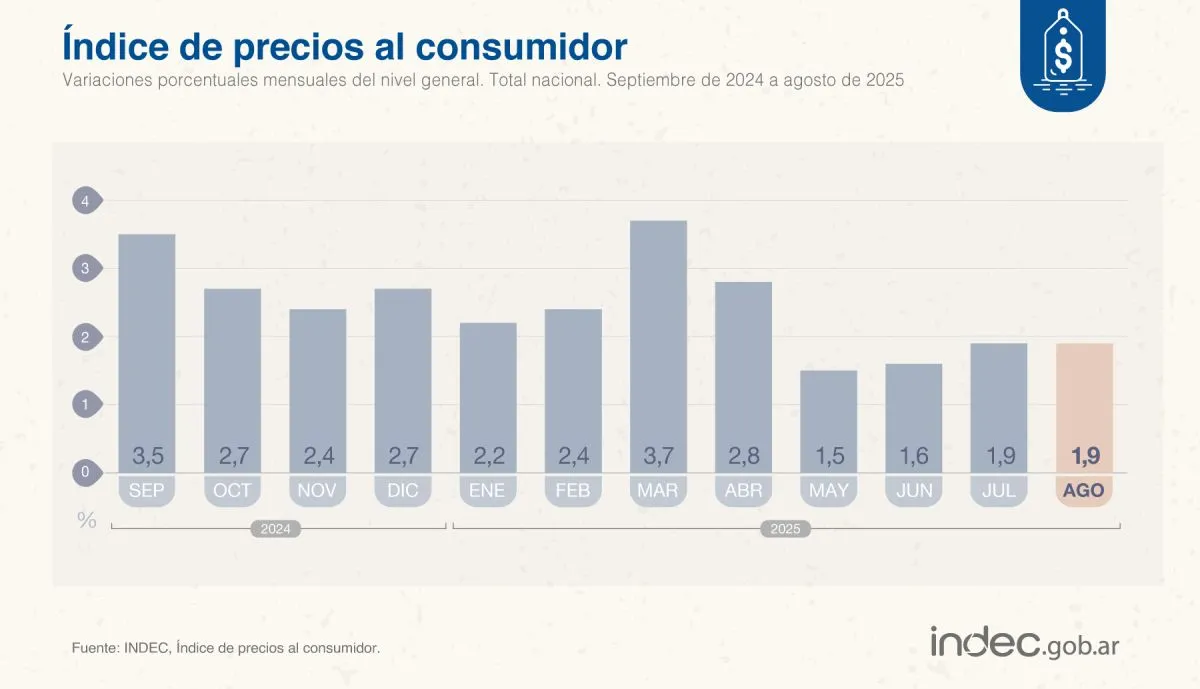 La inflación de agosto fue de 1,9% y acumuló un 33,6% en los últimos doce meses, según informó este miércoles el Indec. A su vez, el acumulado de los ocho meses del 2025 refleja un alza de precios del 19,5%. El número de julio también había ascendido a 1,9%, lo que muestra que en agosto la tendencia inflacionaria se mantuvo.