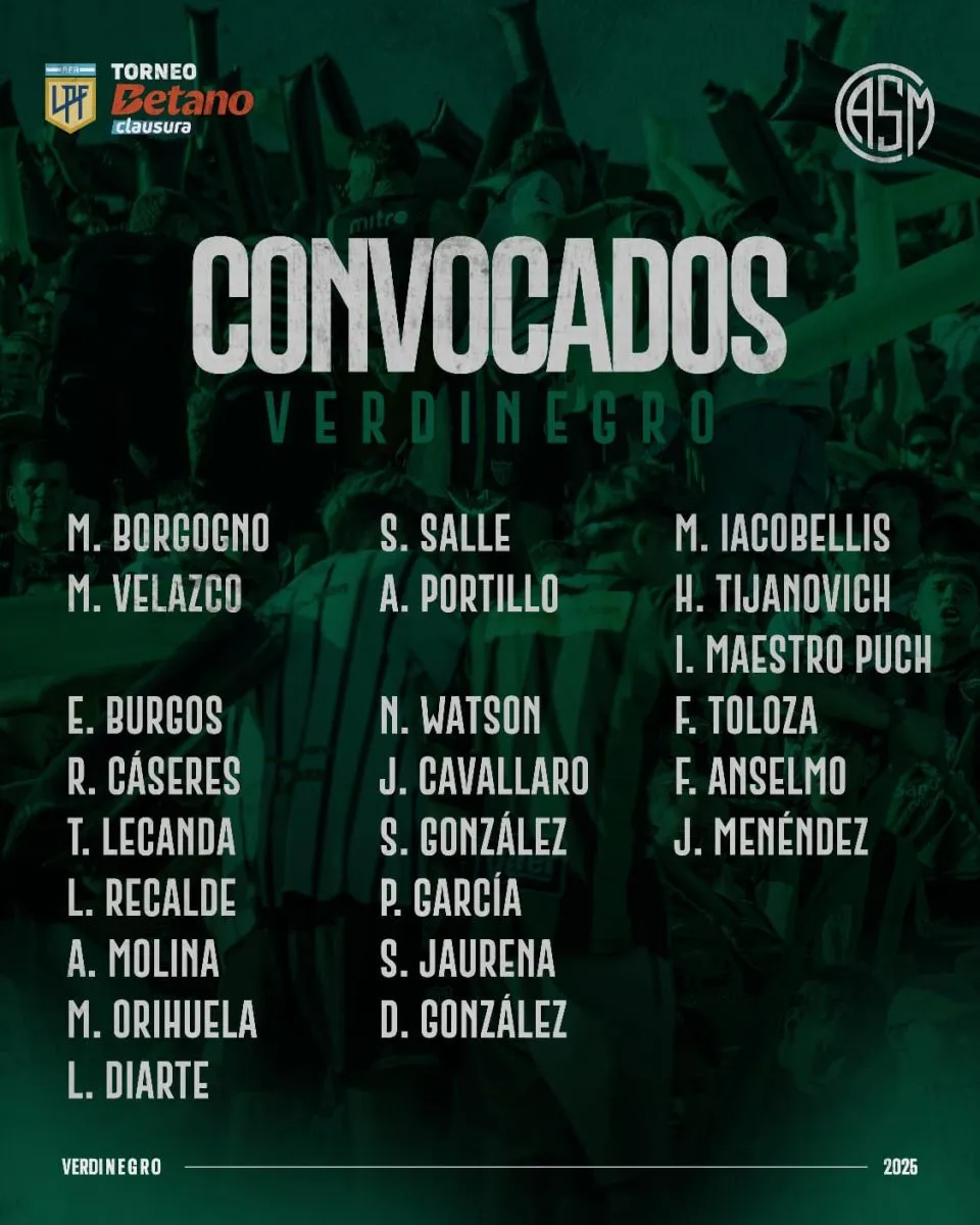Para este compromiso, el técnico del Verdinegro confirmó a los convocados: Borgogno, Velazco, Burgos, Cáseres, Lecanda, Recalde, Molina, Orihuela, Diarte, Salle, Portillo, Watson, Cavallaro, S. González, García, Jaurena, D. González, Iacobellis, Tijanovich, Maestro Puch, Toloza, Anselmo y Menéndez.