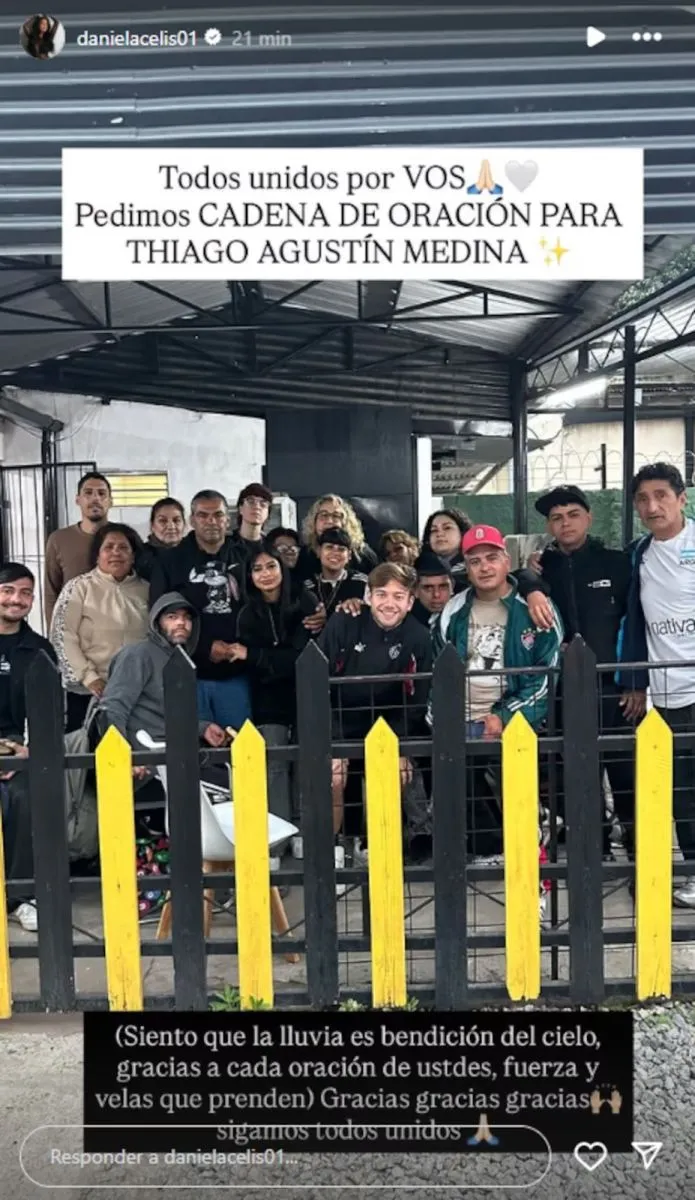 Minutos antes de la difusión del comunicado, Daniela Celis, expareja de Thiago y madre de sus gemelas Laia y Aimé, compartió una publicación en sus redes sociales que daba cuenta de la inminente operación: "Todos unidos por vos pedimos cadena de oración para Thiago Agustín Medina. Siento que la lluvia es bendición del cielo, gracias a cada oración de ustedes, fuerza y velas que prenden. Gracias, sigamos todos unidos", escribió la influencer en una foto en la que se veían los familiares de Thiago y amigos como Nacho Castañares, también ex Gran Hermano.