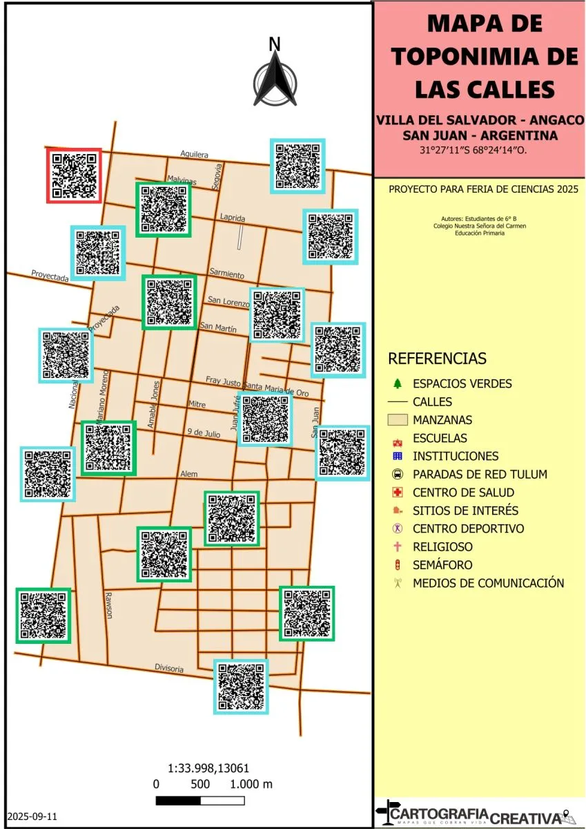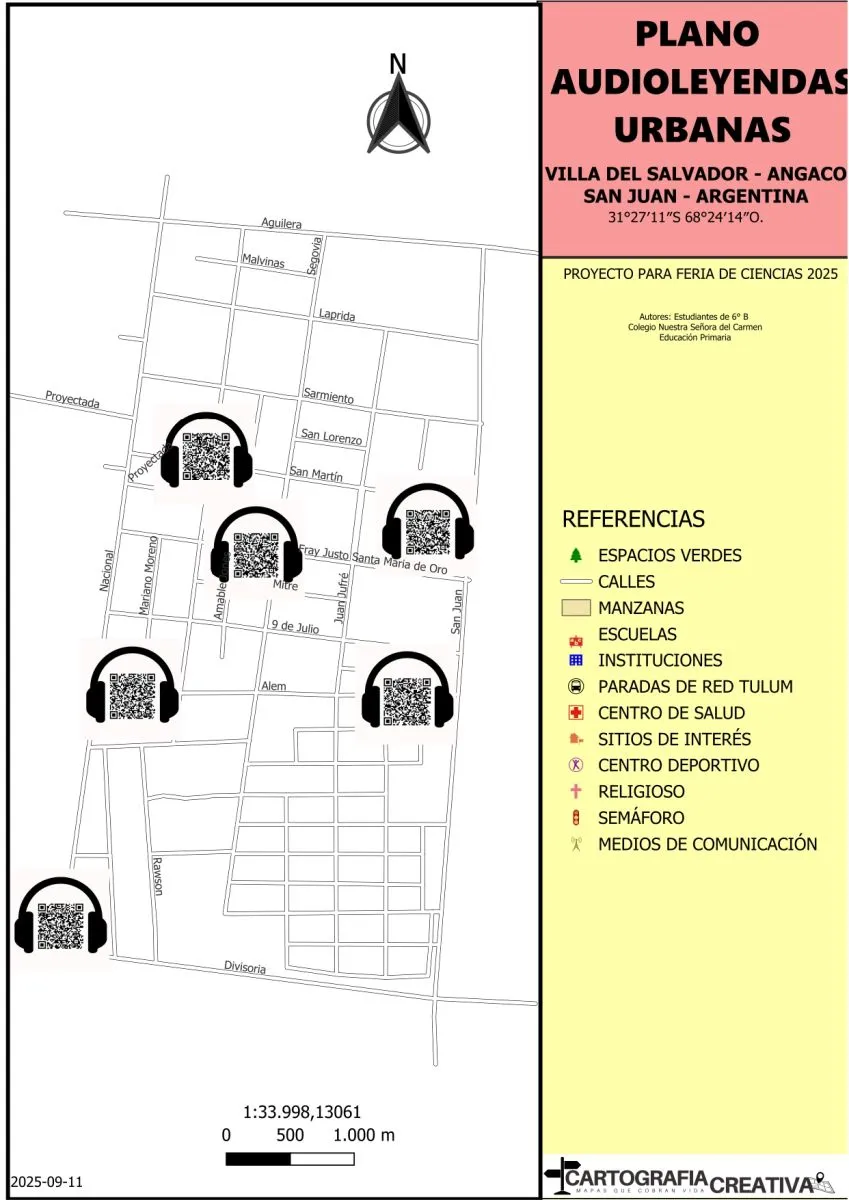 Los alumnos de sexto B del Colegio de Nuestra Señora del Carmen de Angaco se encuentran en la Feria Nacional de Ciencias en Posadas presentando un novedoso proyecto llamado “Cartografía Creativa: Mapas que Cobran Vida”. La propuesta consiste en un plano interactivo de la Villa El Salvador con códigos QR que combinan virtualidad con realidad física, para que la comunidad conozca y mantenga el patrimonio intangible del departamento.