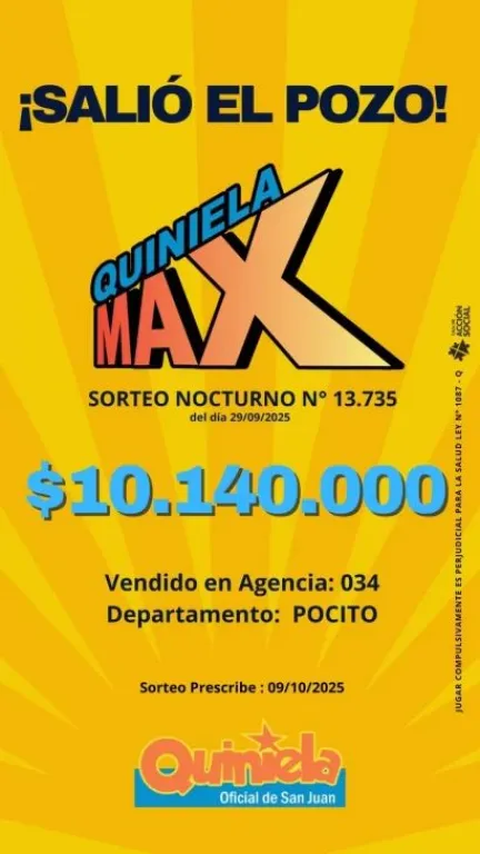 La suerte llegó a Pocito en el sorteo nocturno N.º 13.735 de la Quiniela Max. La Caja de Acción Social confirmó que un apostador se llevó el pozo acumulado, que ascendió a $10.140.000.