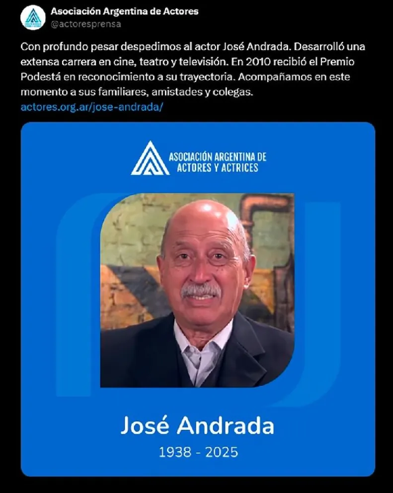 El mundo del espectáculo despidió este miércoles a José Andrada, actor cuyo nombre real era José Manuel Andrada Márquez, nacido el 20 de julio de 1938 en Buenos Aires. La noticia del deceso, informada por la Asociación Argentina de Actores y Actrices, conmocionó a toda la comunidad artística: la voz de un referente de la actuación se apagó, pero su huella resulta imposible de soslayar.