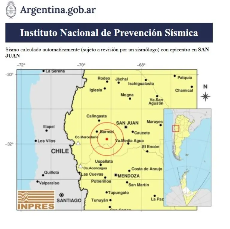 En las primeras horas de este jueves, un sismo de magnitud 5,2 se registró en San Juan, según informó el Instituto Nacional de Prevención Sísmica (INPRES). El movimiento telúrico ocurrió a las 7:42 de la mañana, con epicentro a 71 kilómetros al suroeste de la capital sanjuanina, 116 km al norte de Mendoza y 40 km al sureste de Barreal, con una profundidad de 110 kilómetros.