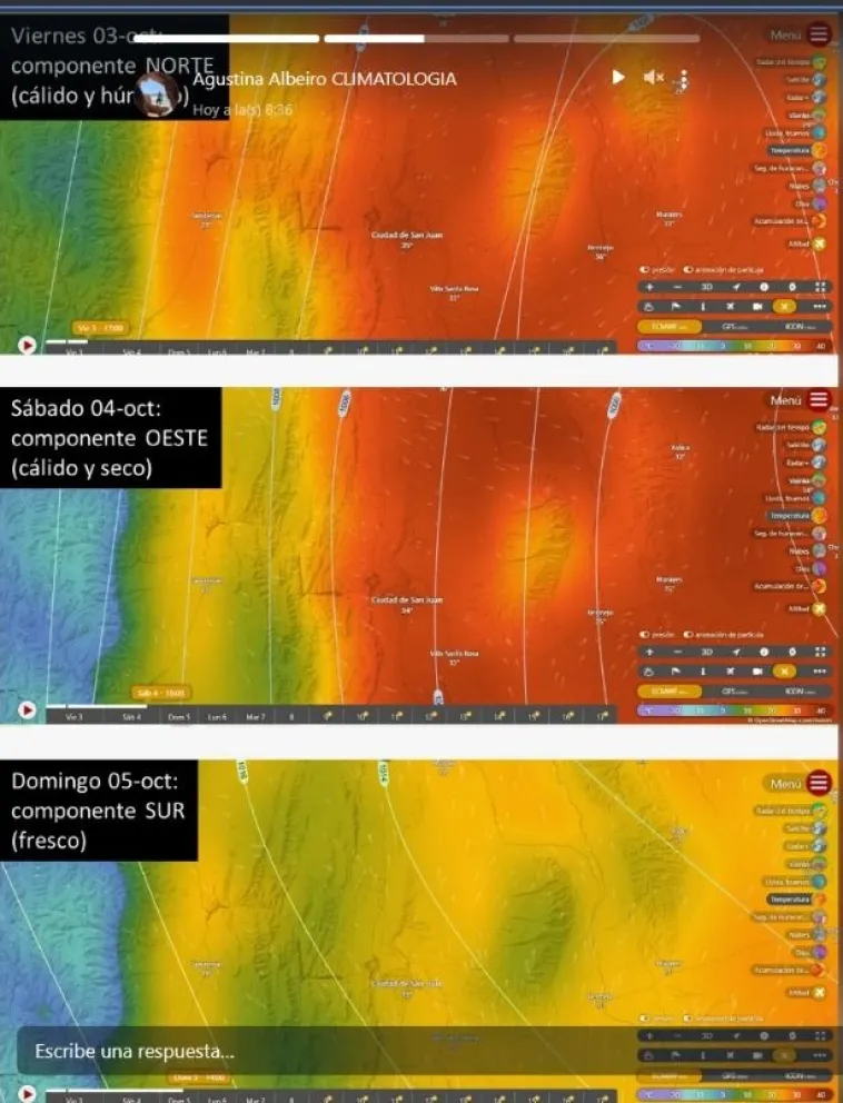 Todo indica que mañana el termómetro marcará cerca de los 33 grados, por lo que se espera otra jornada calurosa y con cielo despejado"La chica del clima", climatóloga de las redes sociales que suma seguidores, indicó que en horas de la siesta el viento será del Este, pero luego rotará al Oeste para que el Zonda comience a hacerse sentir. En este sentido, el Servicio Meteorológico Nacional y Alberiro coinciden en la llegada del Zonda. El SMN anuncia ráfagas de hasta 59 kilómetros por hora y emitió un alerta amarilla para la zona precordillera de Calingasta, Precordillera de Pocito, Precordillera de Rivadavia, Precordillera de Sarmiento, Ullum y Zonda.