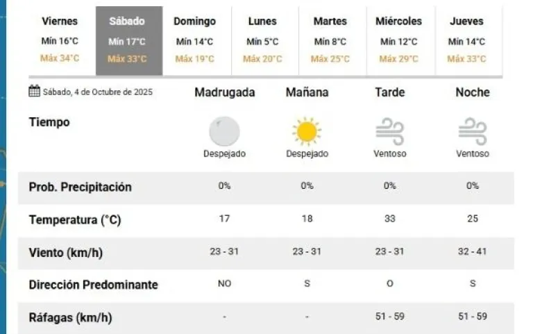 Se mire el pronóstico que se mire, todos coinciden en que el fin de semana se vivirán dos días ventosos y habrá viento para todos los gustos: Norte, Zonda y Sur. Lo cierto es que el calor de este viernes se extenderá a mañana y recién el domingo habrá un descenso.