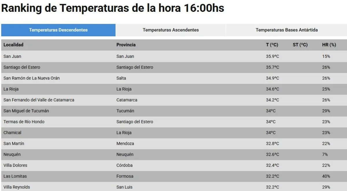 En la previa al arribo de dicho fenómeno climático, la temperatura a las 16 horas en San Juan alcanzó los 35,9º, siendo la provincia más calurosa del país, de acuerdo a lo informado en el ranking del SMN. Mientras que, segunda, se ubicó Santiago del Estero con 35,7º, y tercera, lo hizo Salta con 34,9º.
