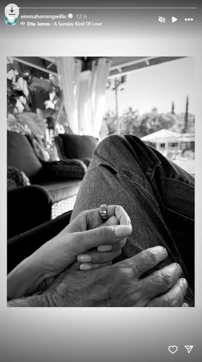 En la otra instantánea, que sí es actual y también es en blanco y negro, Heming rodea la mano de Willis con la suya. El detalle es que el actor no es el que está tomando a su esposa sino que es al revés.