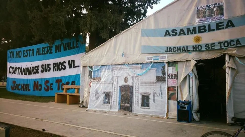 Desde hace más de una década esa carpa blanca está ubicada en el punto neurálgico de Jáchal e incluso tuvo visitantes reconocidos a nivel nacional para mostrar su adhesión a esta protesta. Uno de ellos fue el cantante Axel, quien en 2018 dijo presente para colocarse una remera con la inscripción "Jáchal no se toca" y cantó algunas canciones en el lugar, junto a los ciudadanos. También, un grupo de estos manifestantes viajaron en diversas ocasiones a Capital Federal para solicitar el cierre de la mina ante legisladores en el Congreso de la Nación, algo que finalmente nunca ocurrió.