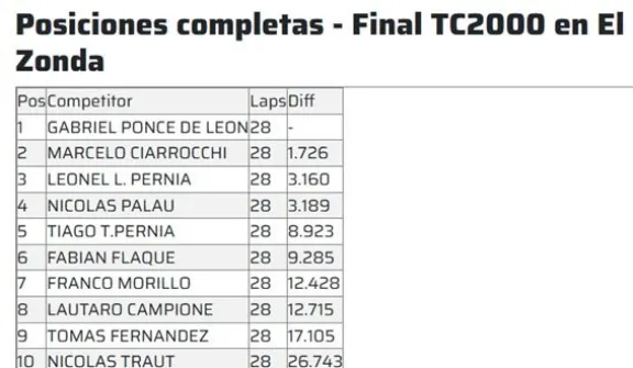 Finalmente, el triunfo fue para Gabriel Ponce de León, quien cruzó la bandera a cuadros con autoridad en El Zonda. Marcelo Ciarrocchi se quedó con el segundo lugar, mientras que Leonel Pernía completó el podio. Detrás, Nicolás Palau y Tiago Pernía cerraron el top cinco de la carrera.