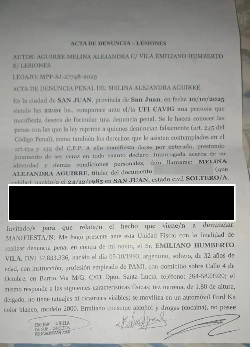 Ante la situación de violencia de género, Melina radicó la denuncia correspondiente por lesiones en UFI CAVIG contra Emiliano Vila para que la Justicia tome cartas en el asunto y se evite un trágico desenlace.