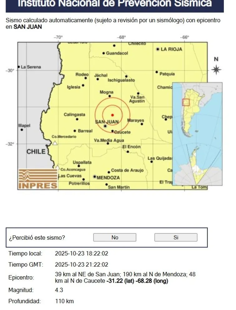 El Inpres informó que la profundidad resultó de 110 kilómetros: el epicentro, a 39 kilómetros al noreste de la Capital.