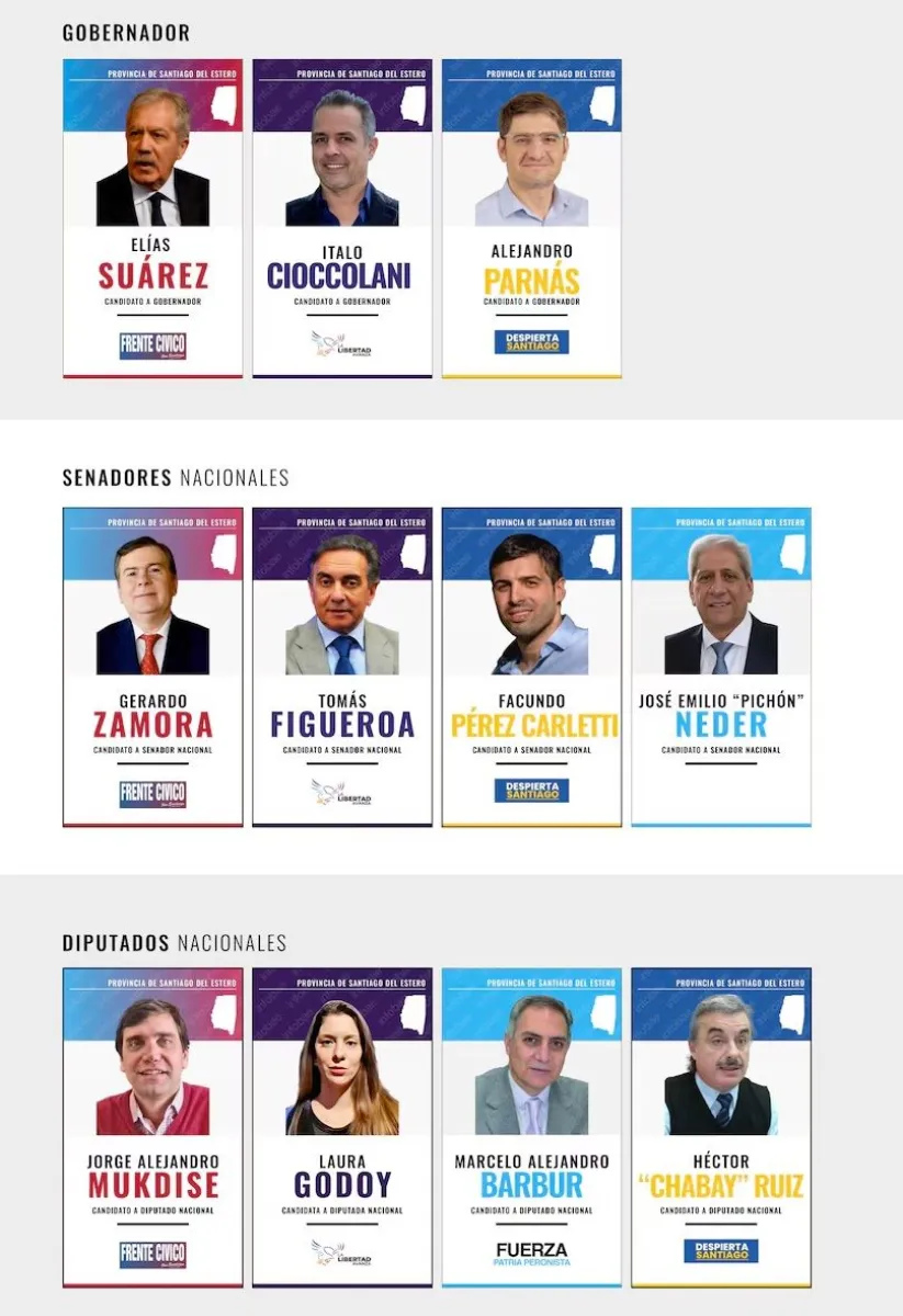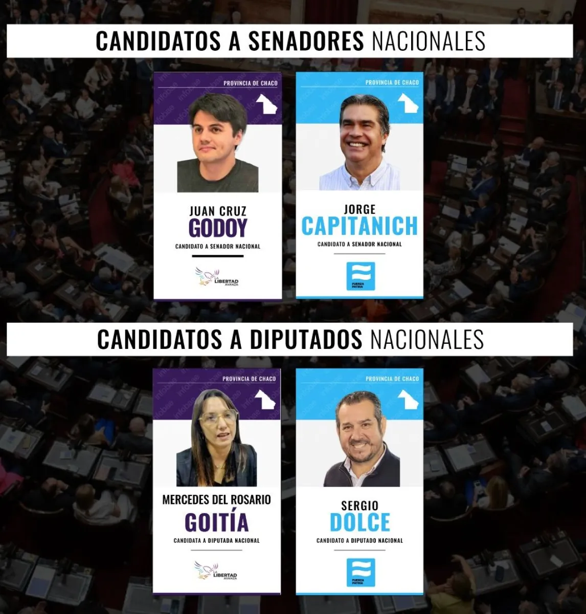 • Peronismo: Postula a Capitanich y Magda Ayala para el Senado; y a Sergio Dolce, Julieta Campo, Juan Manuel García y Luisina Lita para Diputados.