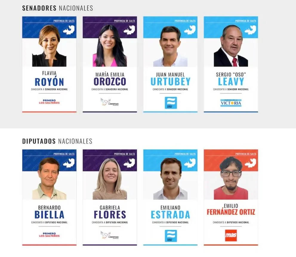 • Primero los Salteños (Oficialismo Provincial): El frente apoyado por el gobernador Gustavo Sáenz presenta a Flavia Royón como candidata a senadora y a Bernardo Biella para diputado. Sáenz se impuso en las elecciones provinciales de mayo, aunque LLA ganó en la capital.