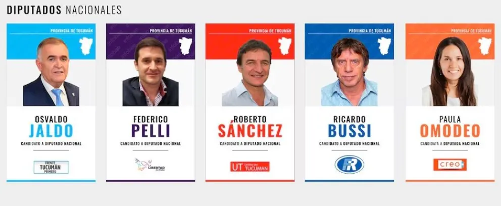 • Frente Tucumán Primero (Peronismo Local): La lista es encabezada de manera testimonial por el gobernador Osvaldo Jaldo, seguido por Gladys Medina, Javier Noguera y Elia Fernández de Mansilla. El frente espera obtener tres escaños.