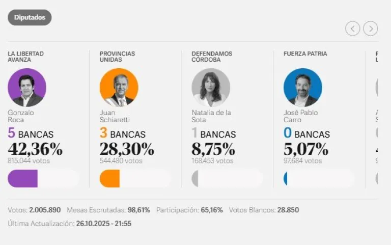 La Libertad Avanza ganó las elecciones en Córdoba y accede a 5 bancas de diputados, con 14 puntos de diferencia entre la lista encabezada por Gonzalo Roca, contra del exgobernador Juan Schiaretti de Provincias Unidas. Natalia de la Sota aparece en tercer lugar con Defendamos Córdoba. A nivel nacional también obtiene un triunfo contundente con 40% de los sufragios.