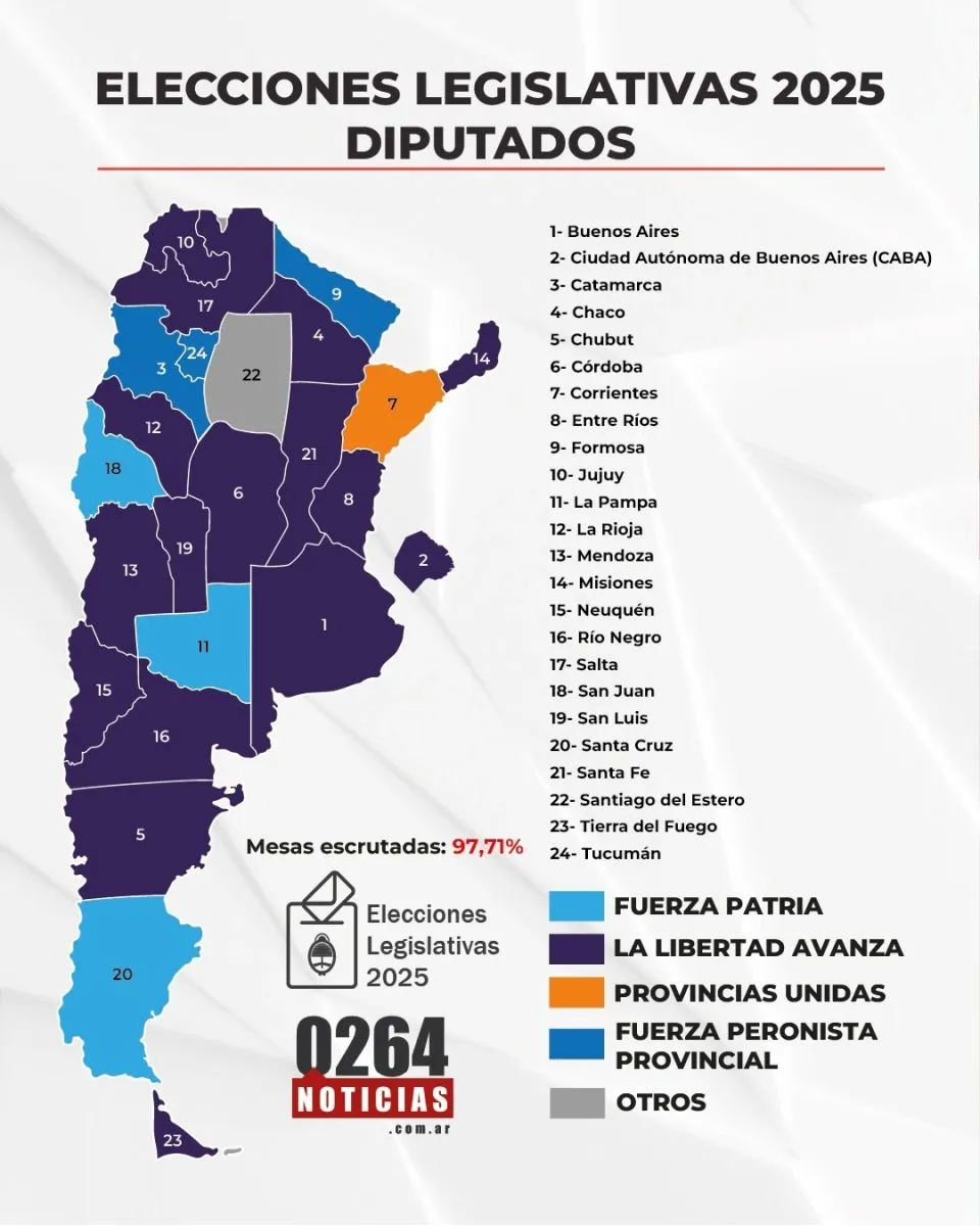 La Libertad Avanza gana las elecciones para la Cámara de Diputados en 16 de distritos: Buenos AiresCABAChubutCorrientesCórdobaEntre RíosJujuyLa RiojaMendozaMisionesNeuquénRío NegroSaltaSan LuisSanta Fe y Tierra del Fuego.