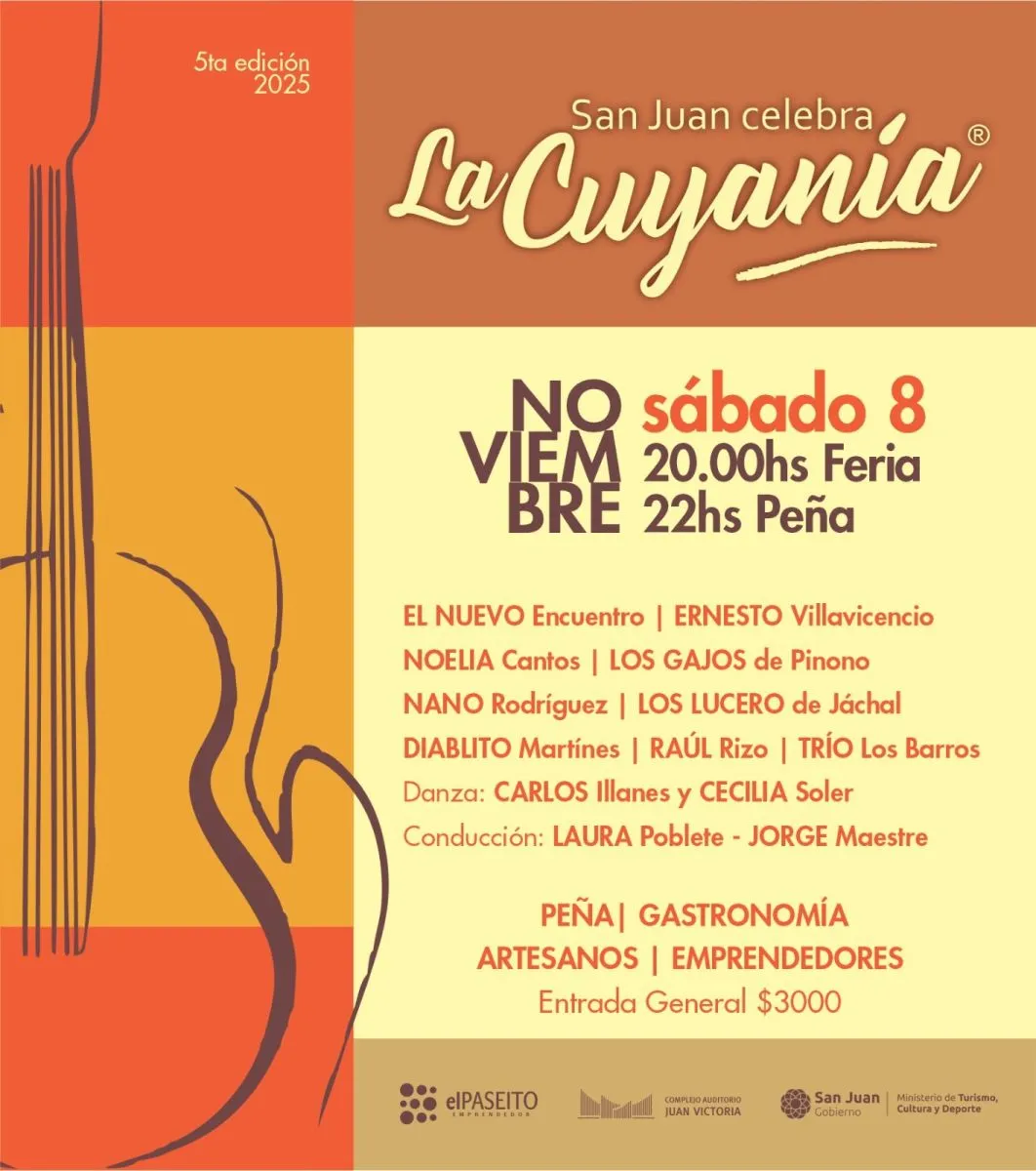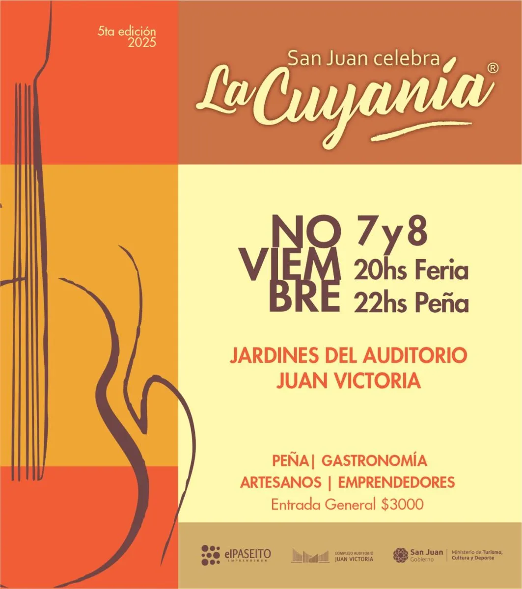 El próximo 7 y 8 de noviembre, se realizará la 5ª edición del Festival de Música Cuyana en los jardines del Auditorio Juan Victoria. Esta propuesta cultural reunirá a músicos locales, feria de emprendedores y artesanos, y un sector gastronómico con comidas típicas.