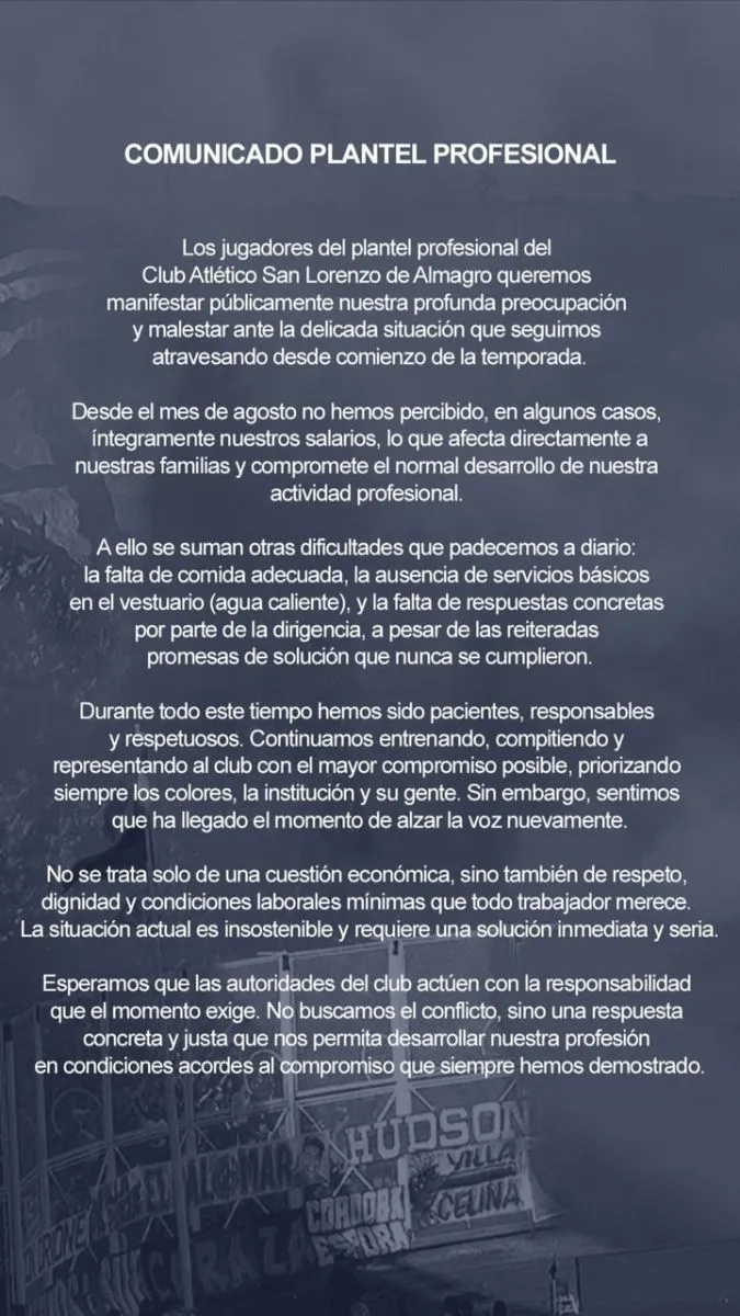 "Los jugadores del plantel profesional del Club Atlético San Lorenzo de Almagro queremos manifestar públicamente nuestra profunda preocupación y malestar ante la delicada situación que seguimos atravesando desde comienzo de la temporada", comenzó el comunicado, que fue compartido en primera instancia por el capitán Gastón Hernández, pero que simultáneamente fue replicándose en las redes sociales de todo el plantel.