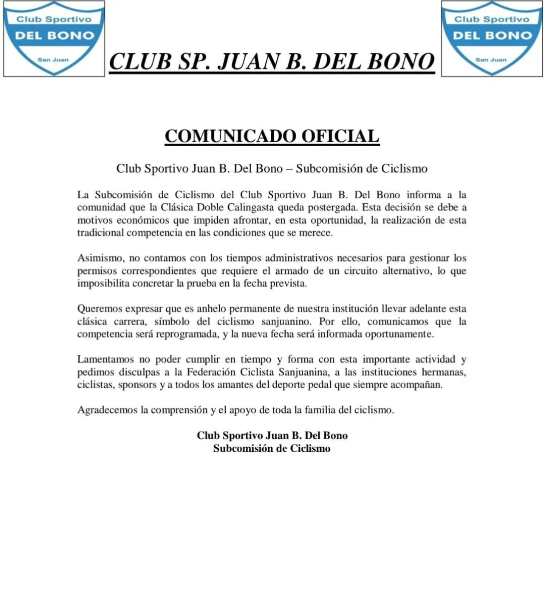 El ciclismo sanjuanino vuelve a quedar paralizado. Este fin de semana debía disputarse la Clásica Doble Calingasta, una de las competencias más tradicionales del calendario rutero, pero finalmente fue suspendida por el Club Del Bono, entidad organizadora, debido a dificultades económicas que impedirán llevarla a cabo con normalidad.
