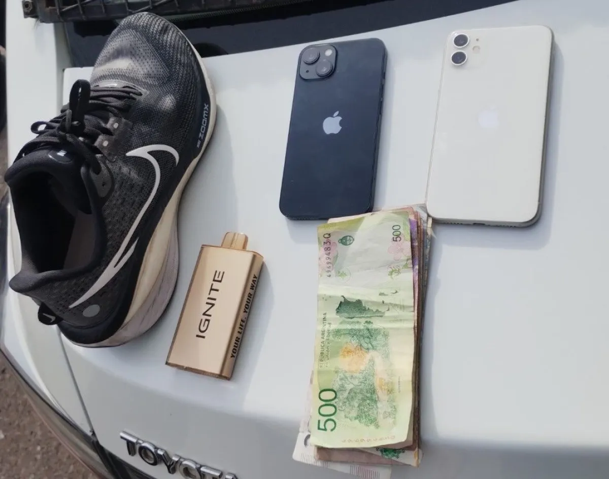 A su vez, según fuentes policiales, los ladrones se llevaron dos teléfonos celulares iPhone, uno de color blanco y otro de color negro, un Baper, un par de zapatillas Nike de color negra y blancas, y dinero en efectivo. Mientas que, la policía recibió un aviso y llegó al lugar, observando a los tres individuos salir del patio de la vivienda. Al percatarse de la presencia policial, los sujetos emprendieron la huida, pero fueron perseguidos y aprehendidos en la intersección de las calles Lemos y Juan Juárez.