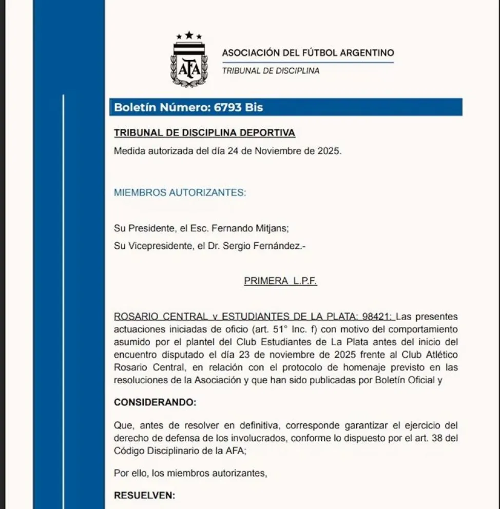 El Tribunal de Disciplina de la AFA abrió un expediente contra Estudiantes por el desplante a Rosario Central