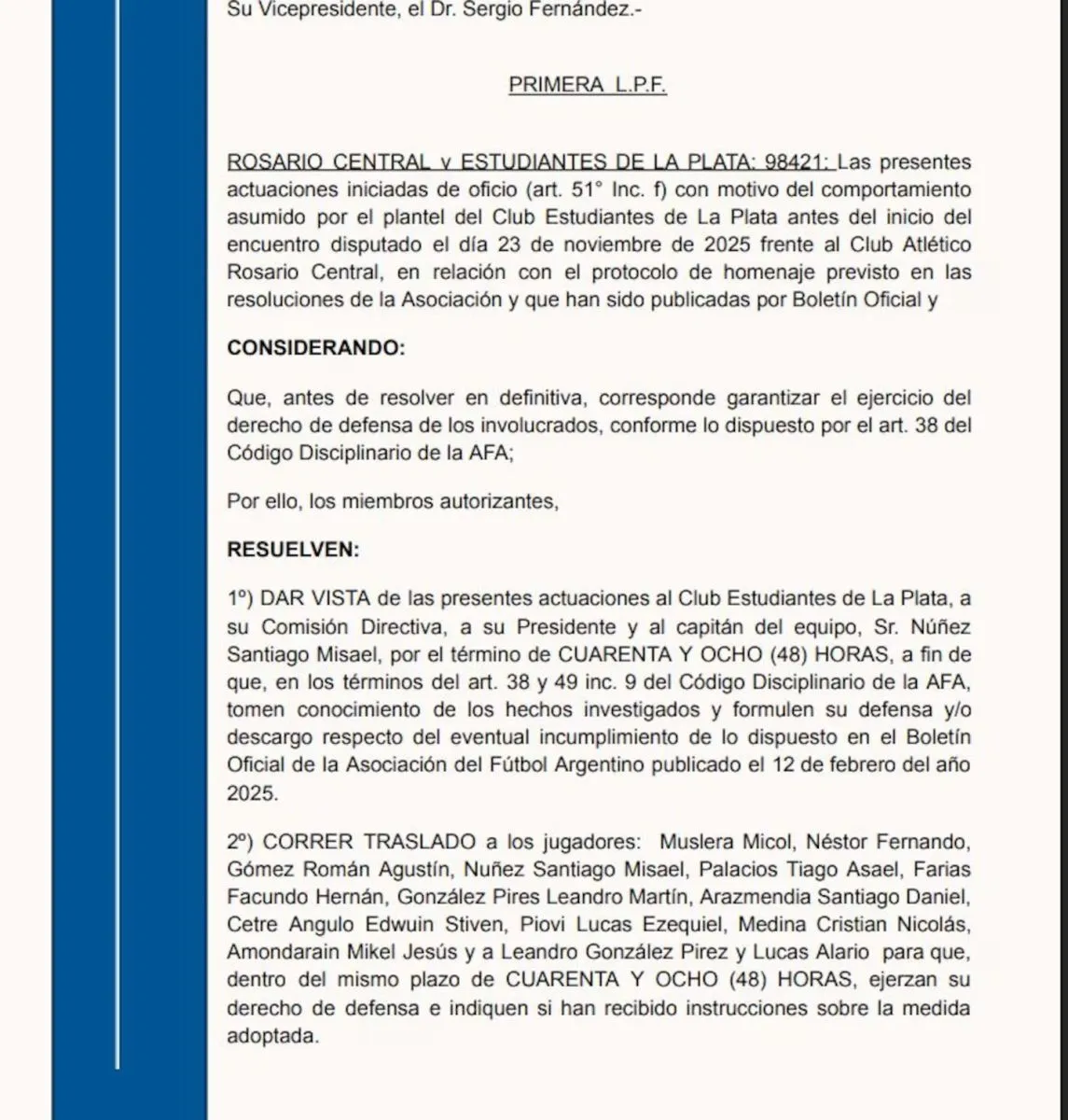 Según consta en la nota que publicó la casa madre del fútbol argentino, el equipo platense tiene 48 horas para justificar la actitud de los futbolistas. Además, insta a los todos los jugadores, a los que cita con nombre y apellido, a que “indiquen si recibieron instrucciones sobre la medida”.