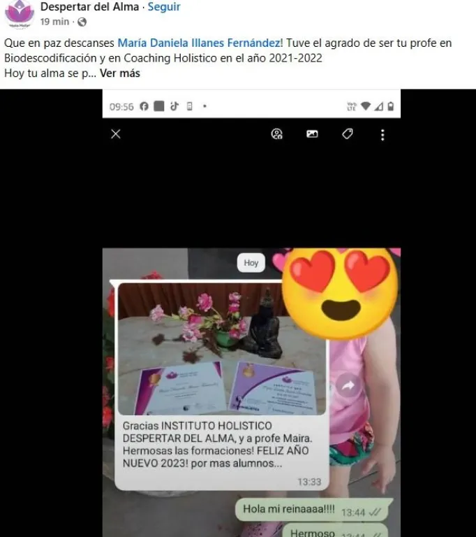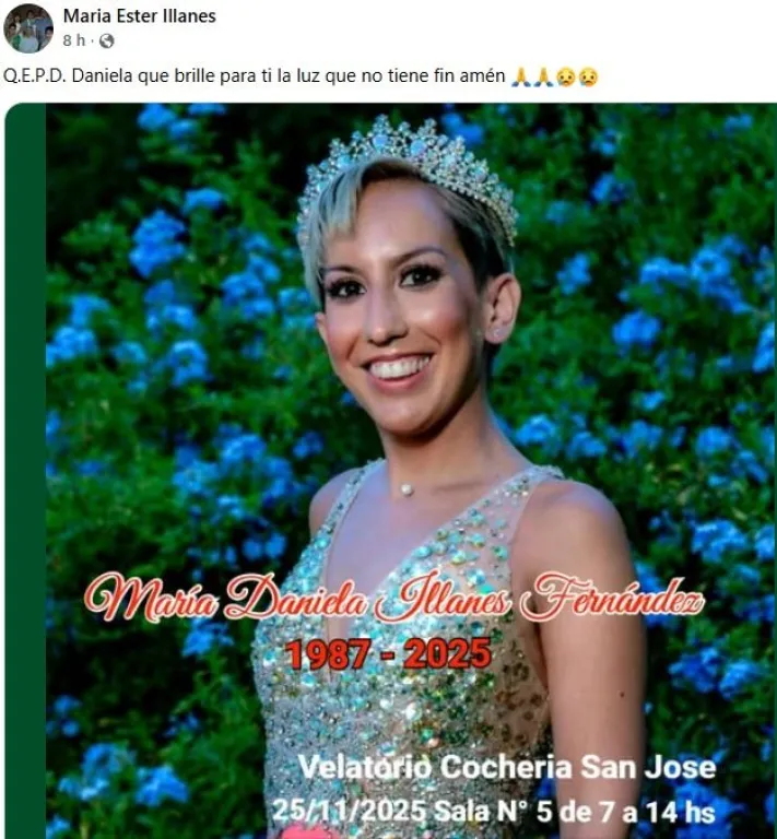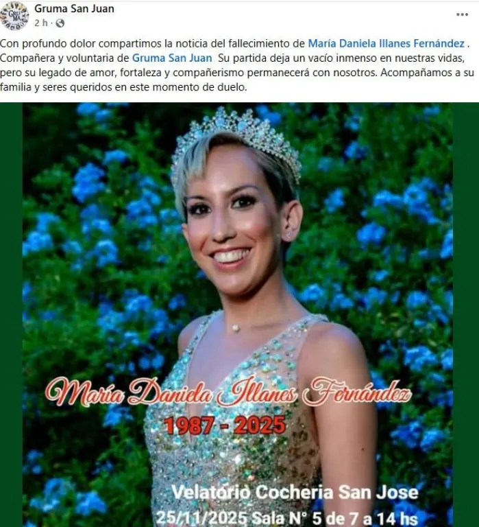“Con profundo dolor compartimos la noticia del fallecimiento de María Daniela Illanes Fernández, compañera y voluntaria de Gruma San Juan. Su partida deja un vacío inmenso en nuestras vidas, pero su legado de amor, fortaleza y compañerismo permanecerá con nosotros. Acompañamos a su familia y seres queridos en este momento de duelo”, expresaron desde la organización.
