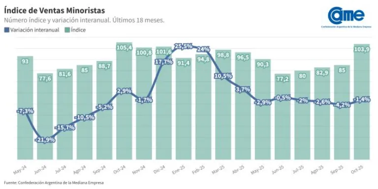 A principios de enero del 2025 hubo una suba, pero desde mayo las cifras interanuales son negativas. Fuente: CAME.