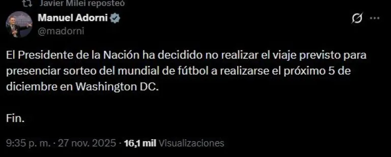 "El Presidente de la Nación ha decidido no realizar el viaje previsto para presenciar sorteo del mundial de fútbol a realizarse el próximo 5 de diciembre en Washington D. C.", expresó Adorno en su cuenta de X.