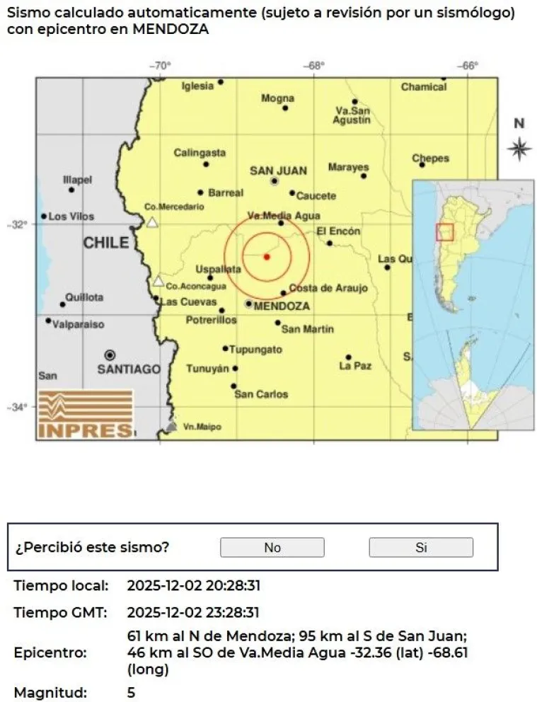 Mientras que, el epicentro ocurrió 95 kilómetros al sur de la Ciudad de San Juan y a 46 kilómetros al suroeste de Media Agüa. En tanto, a 61 kilómetros al norte de Mendoza.