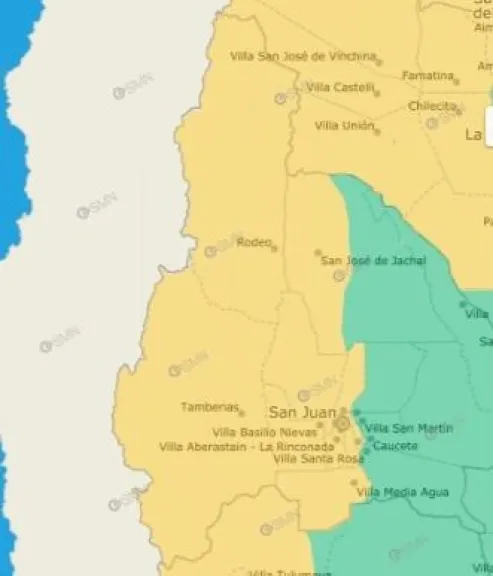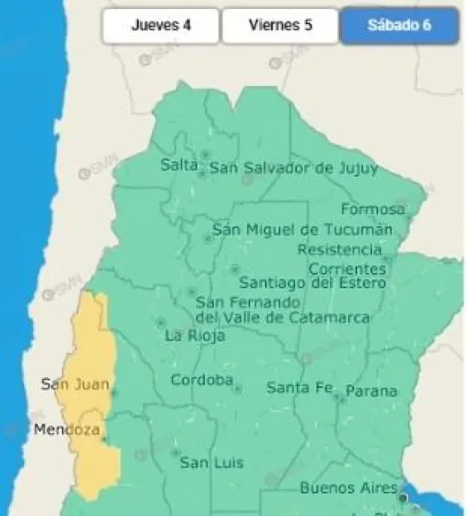 El organismo emitió un alerta amarilla que abarca a los departamentos de 9 de Julio, Albardón, Capital, Chimbas, Rawson - Santa Lucía, Iglesia, Calingasta, ullum, Zona baja de Pocito, Zona baja de Rivadavia y Zona baja de Sarmiento. "El área será afectada por tormentas aisladas de variada intensidad, algunas localmente fuertes. Las mismas podrán estar acompañadas por caída de granizo, frecuente actividad eléctrica, ráfagas de hasta 70 km/h y abundante caída de agua en períodos cortos. Se prevén valores de precipitación acumulada entre 30 y 50 mm, que pueden ser superados en forma puntual. Se espera que los mayores acumulados de precipitación sean hacia la tarde/noche del día sábado 6 de diciembre. En las zonas de alta cordillera las precipitaciones pueden ser mayormente en forma de granizo y/o nieve".