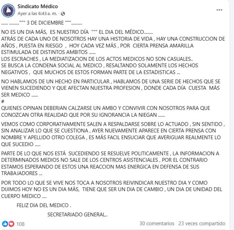 “3 de diciembre no es un día más, es nuestro día, el Día del Médico”, inicia el posteo, donde el Sindicato advierte que detrás de cada profesional “hay una historia de vida, una construcción de años puesta en riesgo, hoy cada vez más, por cierta prensa amarilla estimulada desde distintos ámbitos”.