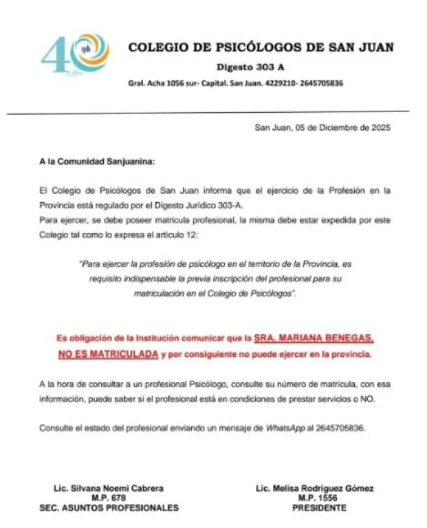 Además, recordaron que el ejercicio profesional está regulado y que todo psicólogo debe contar con matrícula otorgada por el Colegio de Psicólogos. Por eso, recomendaron a los pacientes verificar la matrícula de sus profesionales. Para realizar consultas, habilitaron el número de WhatsApp 2645705836.