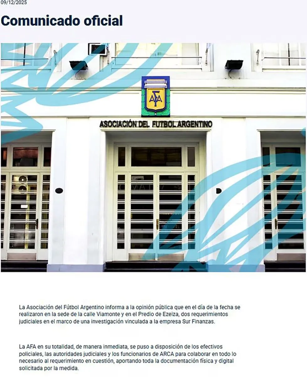 La Asociación del Fútbol Argentino informa a la opinión pública que en el día de la fecha se realizaron en la sede de la calle Viamonte y en el Predio de Ezeiza, dos requerimientos judiciales en el marco de una investigación vinculada a la empresa Sur Finanzas.