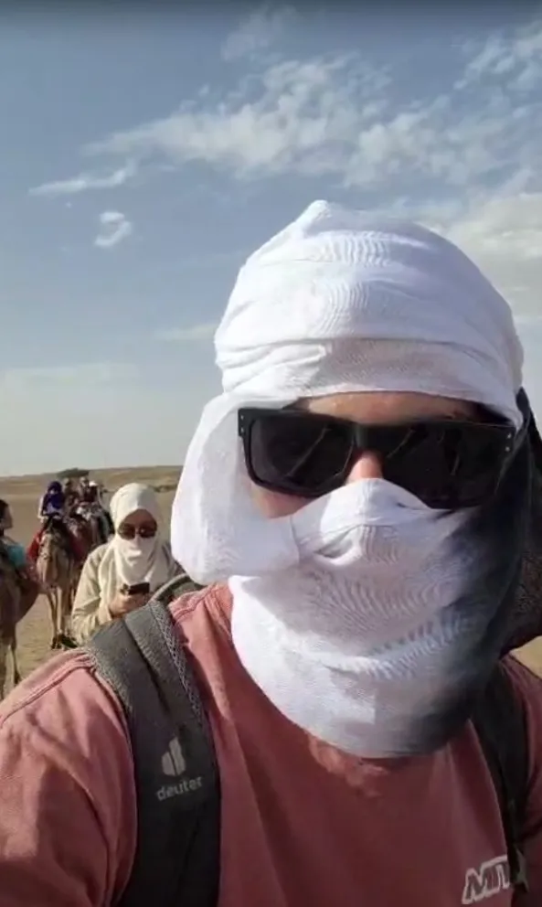 Mati montando un camello por el desierto en Marruecos.