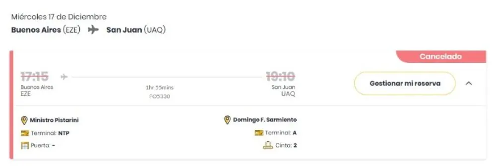 Según la plataforma, Aeropuertos Argentinos, el vuelo de Aerolíneas Argentina mantuvo su vuelo en horario habitual. Sin embargo, sí se canceló el de Flybondi de esta tarde, pero no correspondería a la medida de fuerza ya que la misma se extiende de 8 a 11.