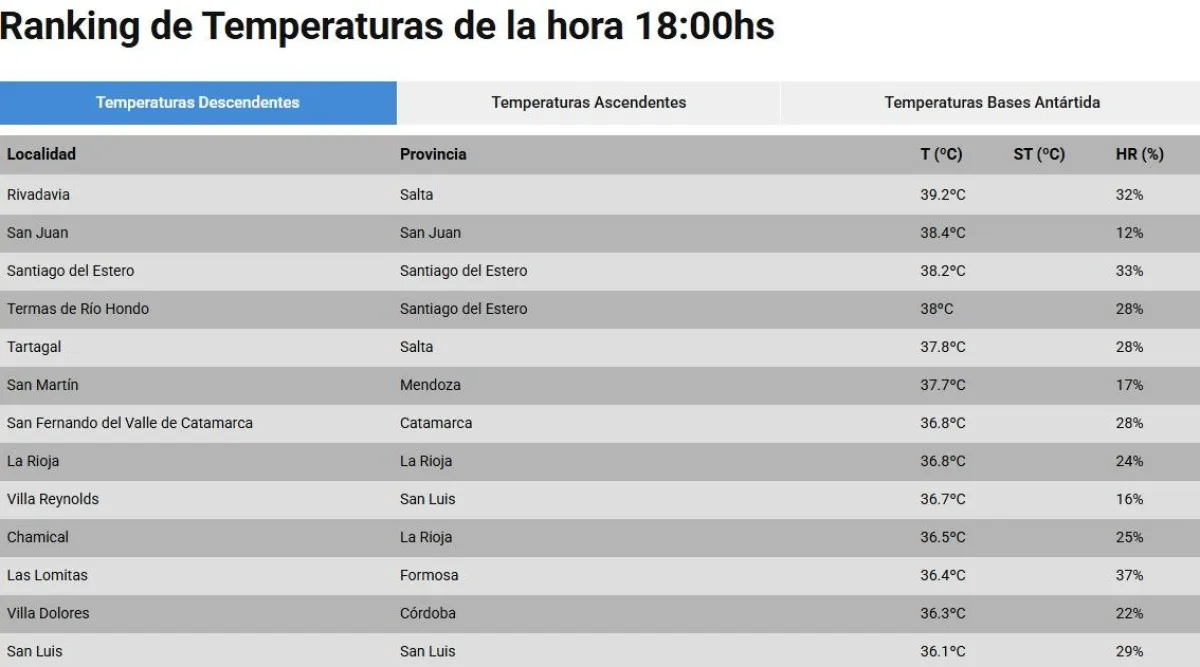 El ranking de máximas temperaturas del Servicio Meteorológico Nacional ubicó, a las 18 horas, a Salta como la número uno, con 39,2º.