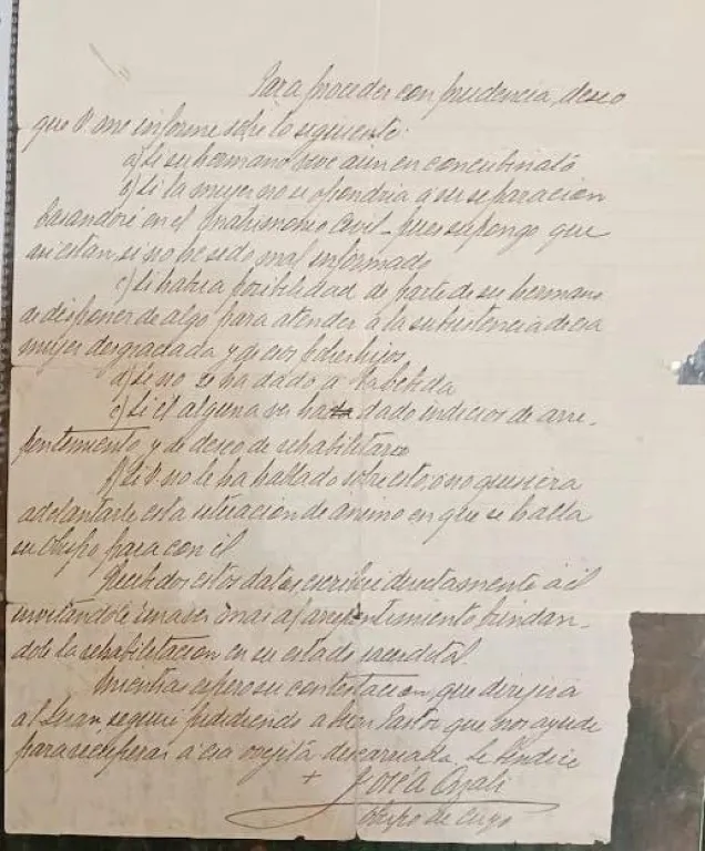 El padre Daniel Beorchia, párroco de 9 de Julio, habló con 0264 Noticias y brindó detalles sobre la importancia del documento: “Hace casi 100 años, en Iglesia, puntualmente en la localidad de Las Flores, había un sacerdote llamado Antolín Alonso Cáceres que llevaba una vida escandalosa: era alcohólico, tenía participación política, era violento y tenía dos hijos con una mujer del lugar. Aun así, monseñor Orzali le dio la oportunidad de continuar como sacerdote”.