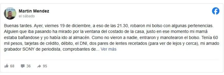 Martín “Tonchi” Méndez sufrió el hurto de un bolso con pertenencias esenciales mientras salió a realizar una compra.