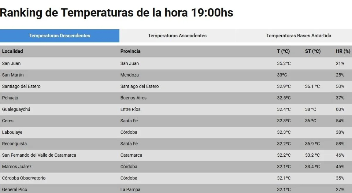 A las 19 horas, el Servicio Meteorológico Nacional la colocó en la cima del ranking de temperaturas máximas en el país.