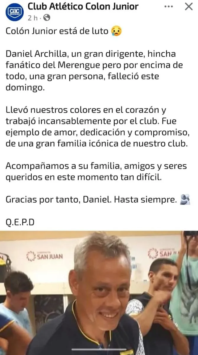 Daniel Archilla era miembro del club y un amante del deporte según describen en un sentido posteo. La Liga Sanjuanina de Fútbol también lo recordó.