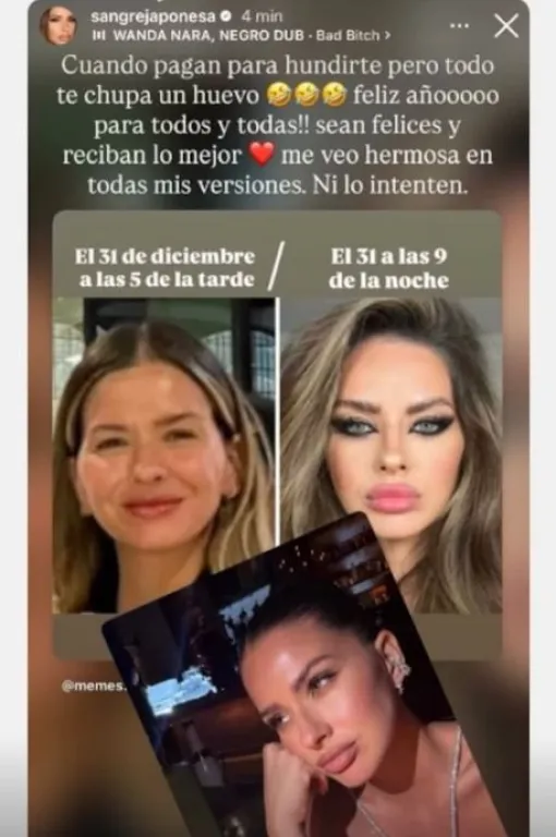 El detalle que le puso aún más picante a la situación: la China eligió musicalizar su respuesta con “Bad bitch”, el hit de Wanda, como para no dejar dudas sobre la destinataria de sus palabras. “Cuando pagan para hundirte pero todo te chupa un huevo. ¡Feliz añoooo para todos y todas! Sean felices y reciban lo mejor”, afirmó, enojadísima. “Me veo hermosa en todas mis versiones. Ni lo intenten”, se despachó, molesta.
