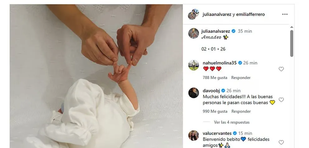 Este fin de semana nació Amadeo, el hijo de Julián Álvarez y María Emilia Ferrero, y la noticia fue confirmada por el propio futbolista a través de sus redes sociales. El delantero del Atlético de Madrid y de la Selección Argentina compartió una emotiva imagen que en pocos minutos generó una enorme repercusión entre sus seguidores.