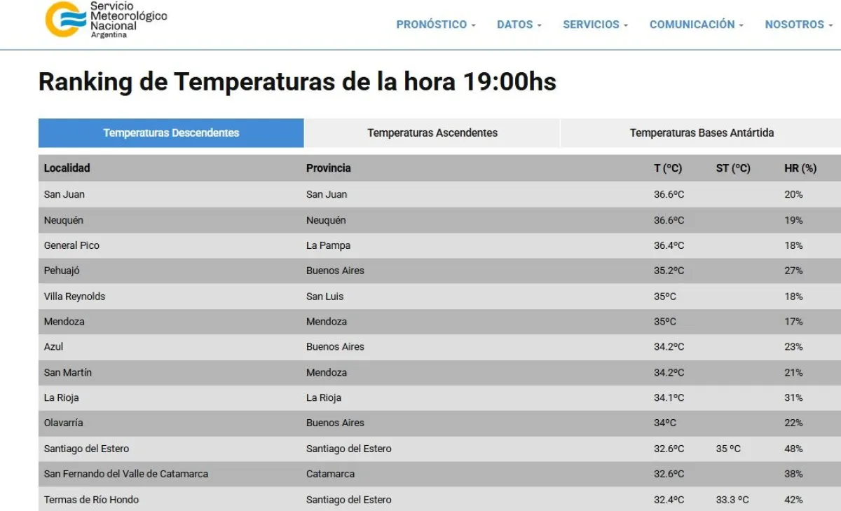 A las 19, el ranking elaborado por el Servicio Meteorológico Nacional ubicaba a San Juan en el primero puesto con 36.6°.