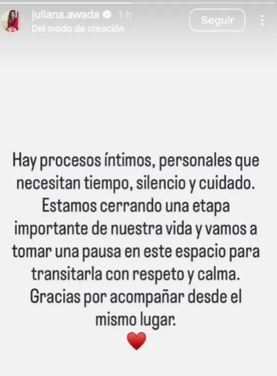 El mensaje se publicó tiempo después de que la noticia trascendiera, por lo que afirma: "Estamos cerrando una etapa importante de nuestra vida”“Vamos a tomar una pausa en este espacio para transitarla con respeto y calma”, agregó Awada y cerró diciendo: “Gracias por acompañar desde el mismo lugar”.