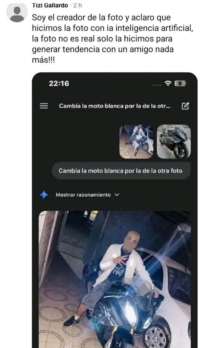 Este posteo causó mucha polémica, y en horas de la tarde, el creador del mismo salió en su propio perfil de redes a aclarar que todo era una broma, utilizando Inteligencia Artificial. "Soy el creador de la foto y aclaro que hicimos la foto con ia inteligencia artificial, la foto no es real solo la hicimos para generar tendencia con un amigo nada más!!!", es el mensaje del usuario Tizi Gallardo.