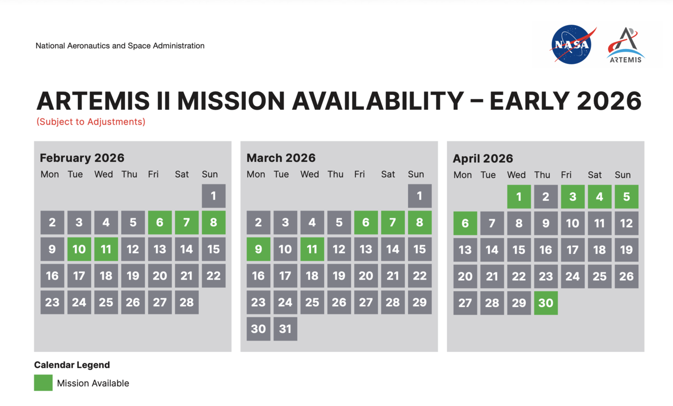 Calendario de ventanas de lanzamiento de Artemis II para principios de 2026.